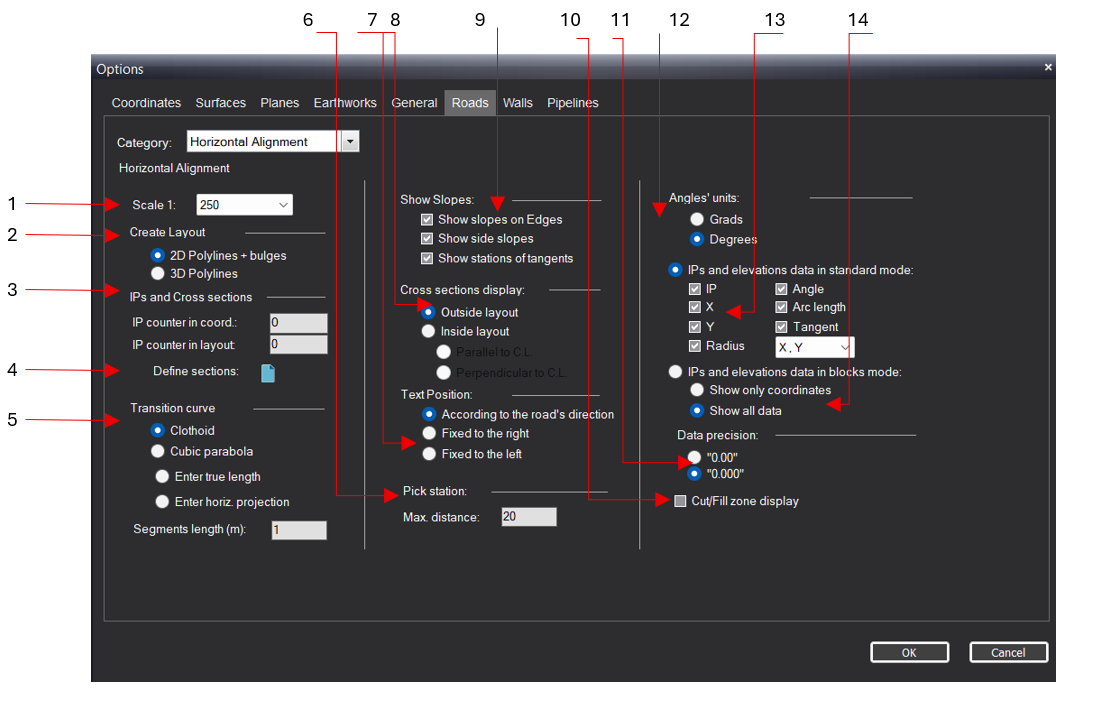 12. Angle dimensions. This will allow you to controll angle's format on the road's elevations. Grads - the elevations' values will be displayed in grads. Degrees - the elevations' values will be displayed in degrees.